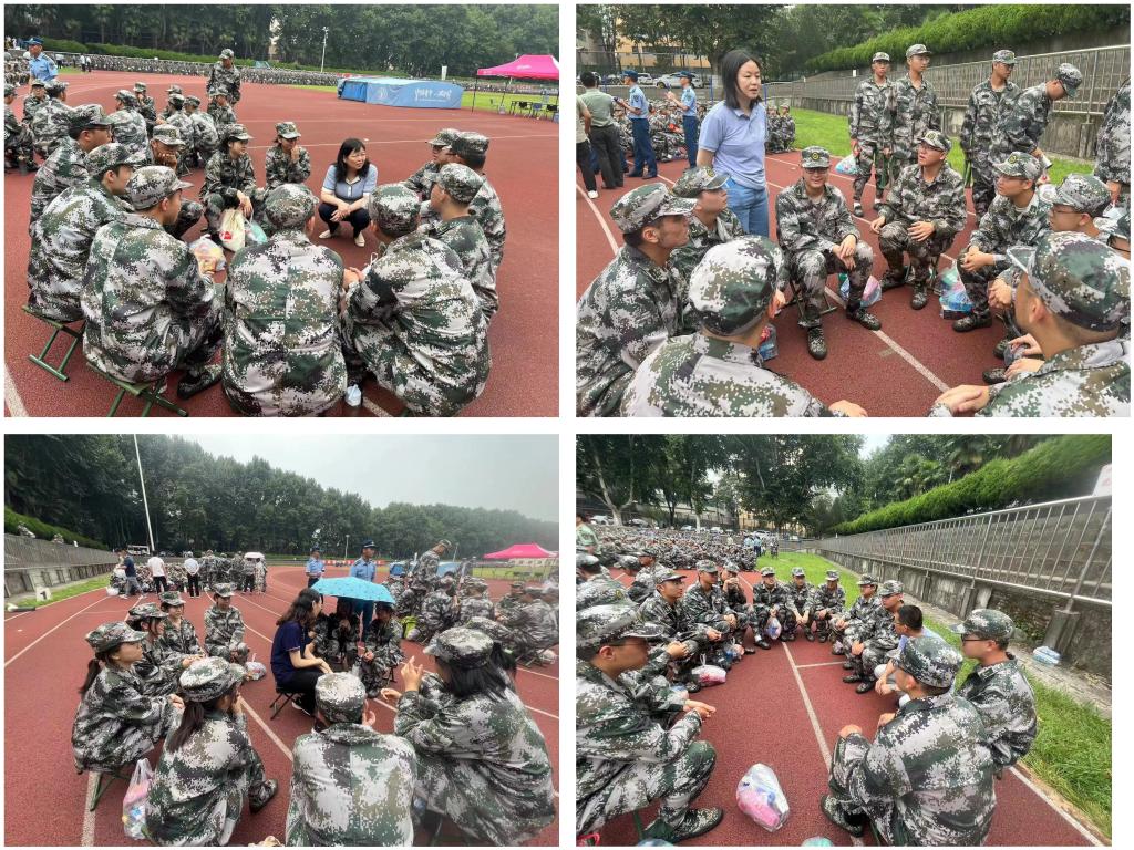 前来慰问的老师们将精心准备的慰问品一一发放到学子们手中,并分组与同学们亲切交谈。“还适应西安的气候和饮食吗?”“一定不要玩游戏,晚上要保证休息。”“我办公室就在化学楼,欢迎大家常来谈心”……同学们围着各位老师畅所欲言,笑声、掌声充满了军训场。