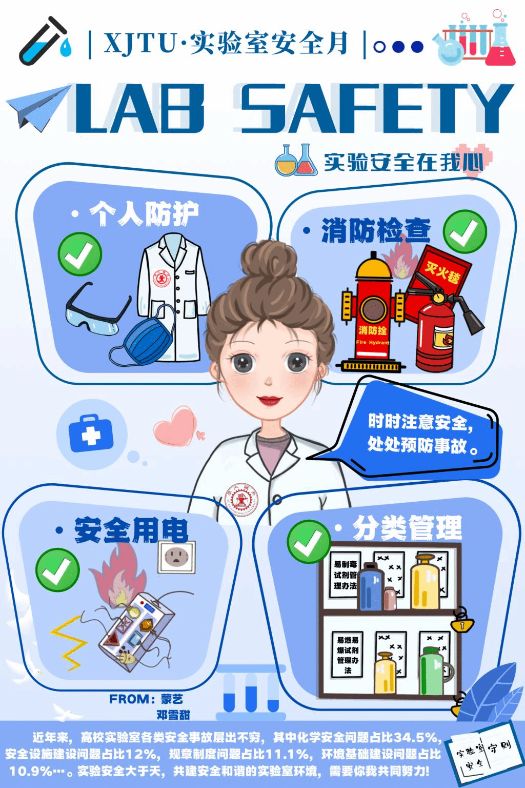 作品简介:近年来,高校实验室各类安全问题层出不穷,本绘画作品旨在呼吁实验人员关注实验安全,提高警惕意识,防患于未然,共同构建安全健康的实验室氛围。此外,本绘画作品采用了卡通的绘画技法,结合必赢唯一官方网站自身实验学科的特点,共表现出了四方面的实验室安全注意事项,包括:个人防护、用电安全、消防安全及实验室危险品分类管理。最后由身穿带有西安交通大学logo的实验服的女生发出实验安全倡导,鼓励大家行动起来共建平安健康校园。